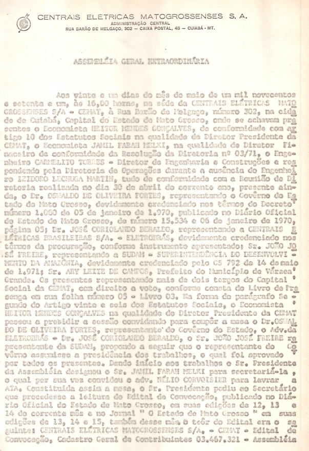 Documentos referentes à Assembleia Geral Extraordinária das Centrais Elétricas Matogrossenses S.A. - CEMAT - ocorrida em 21 de maio de 1971, tendo como ordem do dia integralização do capital subscrito na Assembleia Geral Extraordinária de 18 de dezembro de 1970, aumento do capital social, reforma dos estatutos sociais e outros assuntos de interesse da empresa.