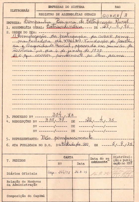 Documentos referentes à Assembleia Geral Extraordinária da Companhia Bahiana de Eletrificação Rural, ocorrida em 28/04/1975, tendo como pauta a homologação da COBER na Fundação de Assistência e Seguridade Social.