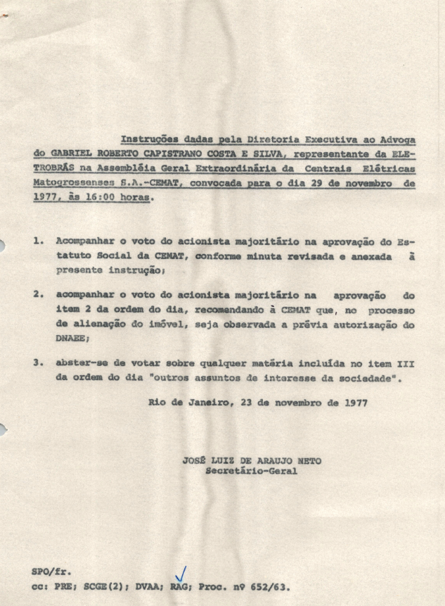 Documentos referentes à Assembleia Geral Extraordinária das Centrais Elétricas Matogrossenses S.A. - CEMAT - ocorrida em 29 de novembro de 1977, tendo como ordem do dia adaptação do estatuto social de sociedade atendendo as exigências do Artigo 296, da Lei das Sociedades por ações, autorização para alienar parte do imóvel da sociedade localizado na cidade de Corumbá para a Prefeitura Municipal de Corumbá, onde funcionava a subestação da empresa, além de outros assuntos de interesse da empresa. Inclui pauta enviada a Gabriel Roberto Capistrano Costa e Silva, representante Eletrobras.