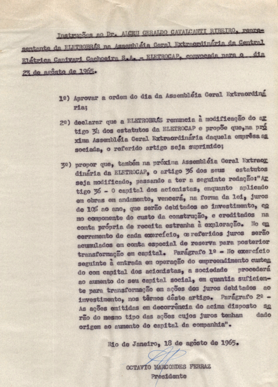 Documentos referentes à Assembleia Geral Extraordinária da Central Elétrica Capivari - Cachoeira (Eletrocap), realizada em 23 de agosto de 1965, tendo como ordem do dia a discussão a respeito dos juros fixados no art. 34 dos estatutos sociais, incidência da taxa de corretagem sobre o capital subscrito pelo fundo de desenvolvimento econômico administrativo pela CODEPAR, na AGE de 9/12/1964 e outros assuntos de interesse da companhia. Possui pauta da reunião, enviada a Alceu Geraldo Cavalcânti Ribeiro, representante da Eletrobras.