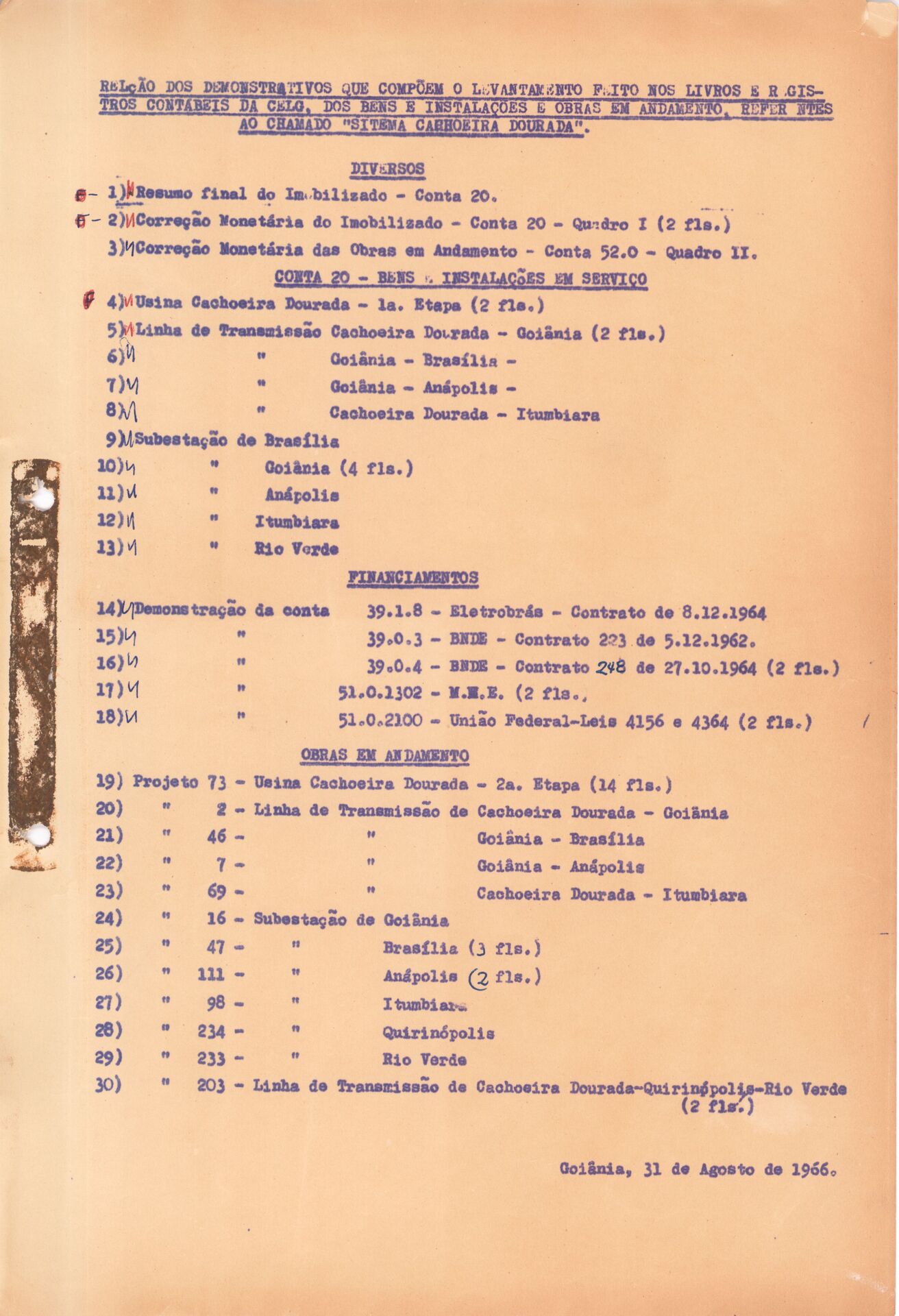Documento relativo aos demonstrativos que compõem o levantamento feito nos livros de registro contábeis da Companhia Energética de Goiás - CELG, dos bens, instalações e obras em andamento referentes ao Sistema Cachoeira Dourada até 01 de setembro de 1966.