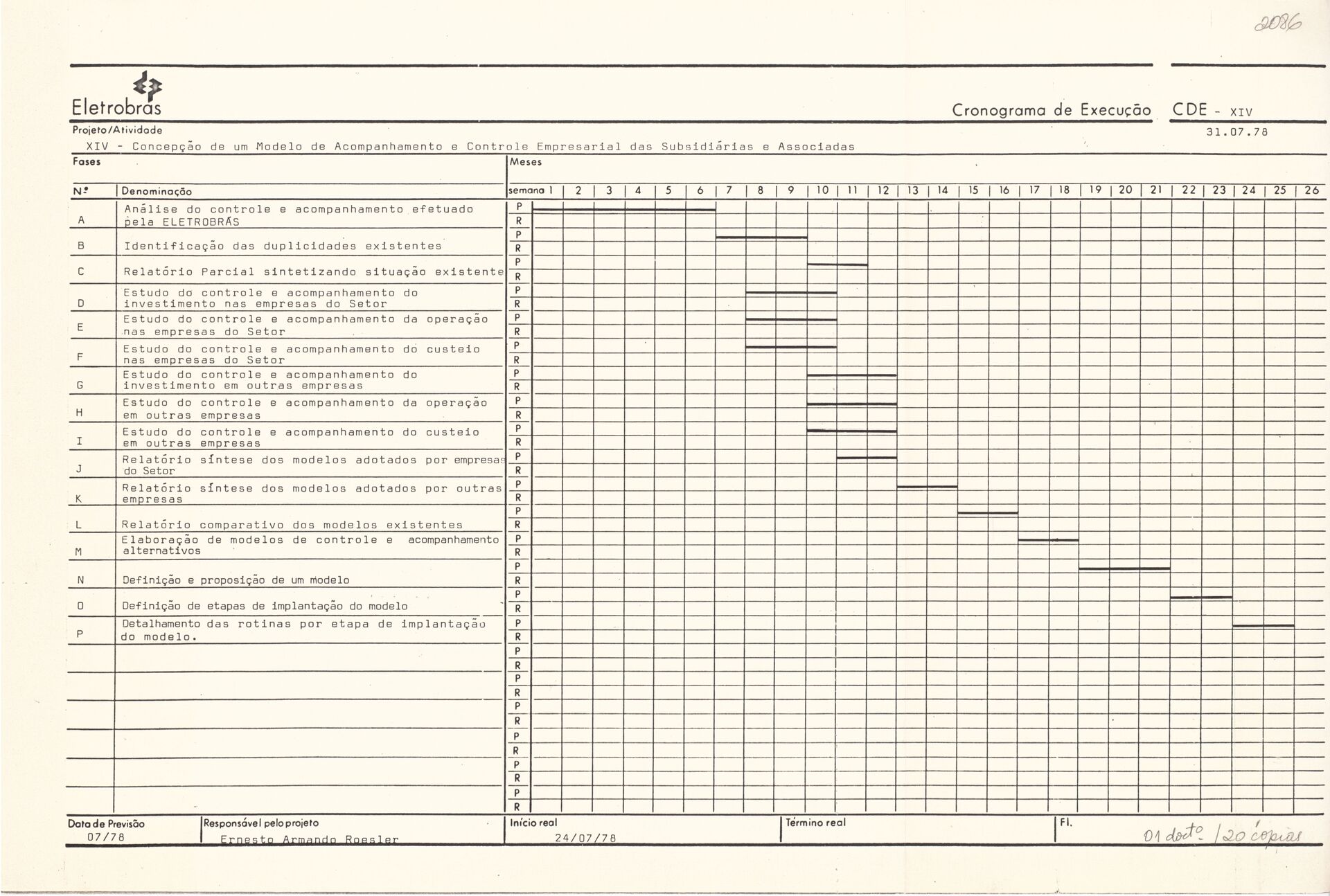Documentos referentes ao cronograma do projeto de concepção de um modelo de acompanhamento e controle empresarial das subsidiárias e associadas da Eletrobras, contendo o planejamento temporal das etapas de desenvolvimento do projeto, definição de prazos, fases de execução, atividades previstas e marcos de acompanhamento voltados à implementação do sistema de gestão e controle empresarial no âmbito do grupo Eletrobras.