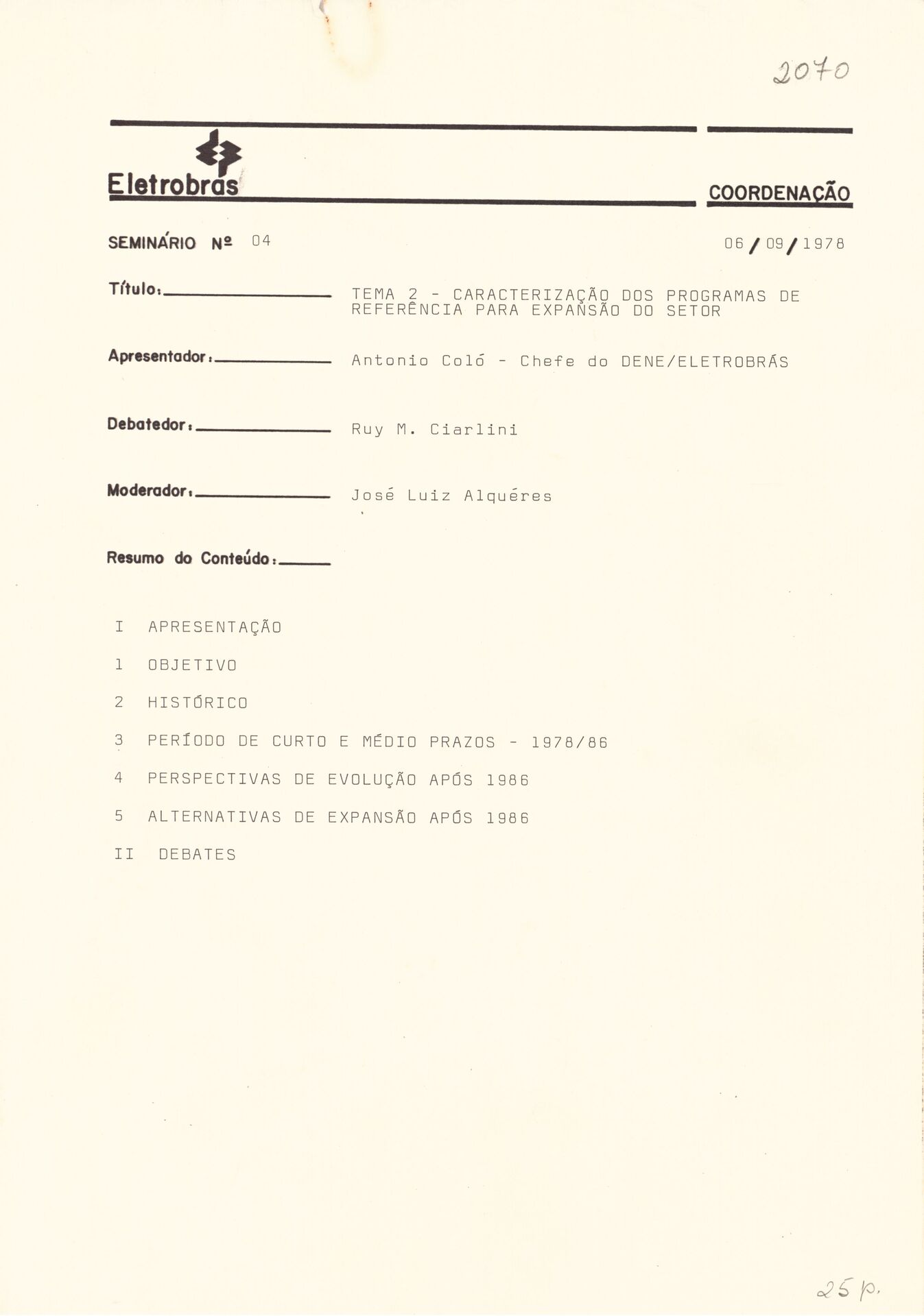 Transcrição de palestra sobre o tema "Caracterização dos programas de referência para expansão do setor", do Departamento de Mercado - DEME da Eletrobras, acerca das alternativas de expansão da capacidade geradora para o sistema elétrico brasileiro até o ano de 2000.
