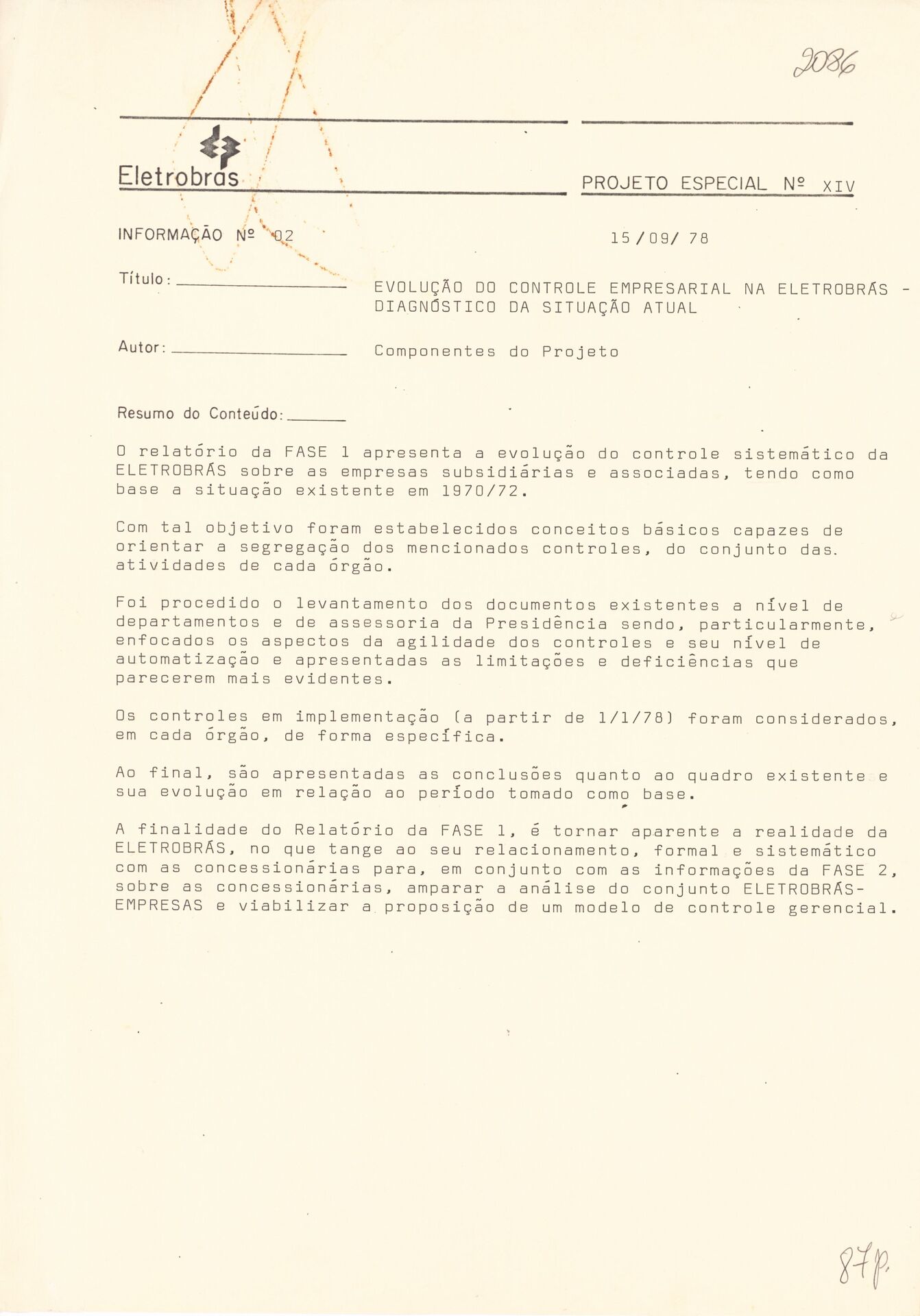 Documentos referentes à evolução do sistema de controle empresarial da Eletrobras, contendo diagnóstico da situação vigente à época, análises sobre a estrutura de gestão e acompanhamento das subsidiárias e empresas associadas, bem como avaliações institucionais voltadas ao aprimoramento dos mecanismos de planejamento, supervisão e controle corporativo.