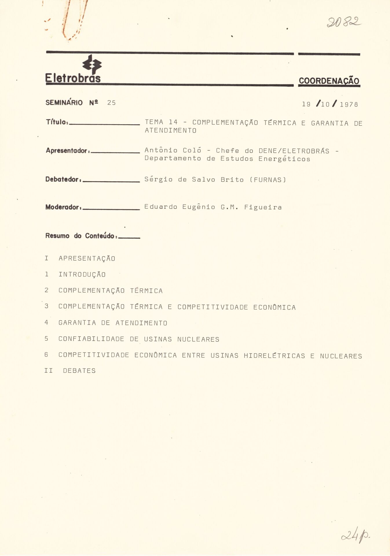 Registro textual de atividade expositiva conduzida por Antonio Coló, do Departamento de Mercado (DEME) da Eletrobras, dedicada à discussão dos conceitos fundamentais de complementação térmica e garantia de atendimento do sistema elétrico. O conteúdo abrange aspectos de confiabilidade das usinas nucleares, critérios econômicos empregados na expansão do parque gerador e análises comparativas da competitividade econômica entre empreendimentos hidrelétricos e nucleares, no contexto do planejamento energético nacional.