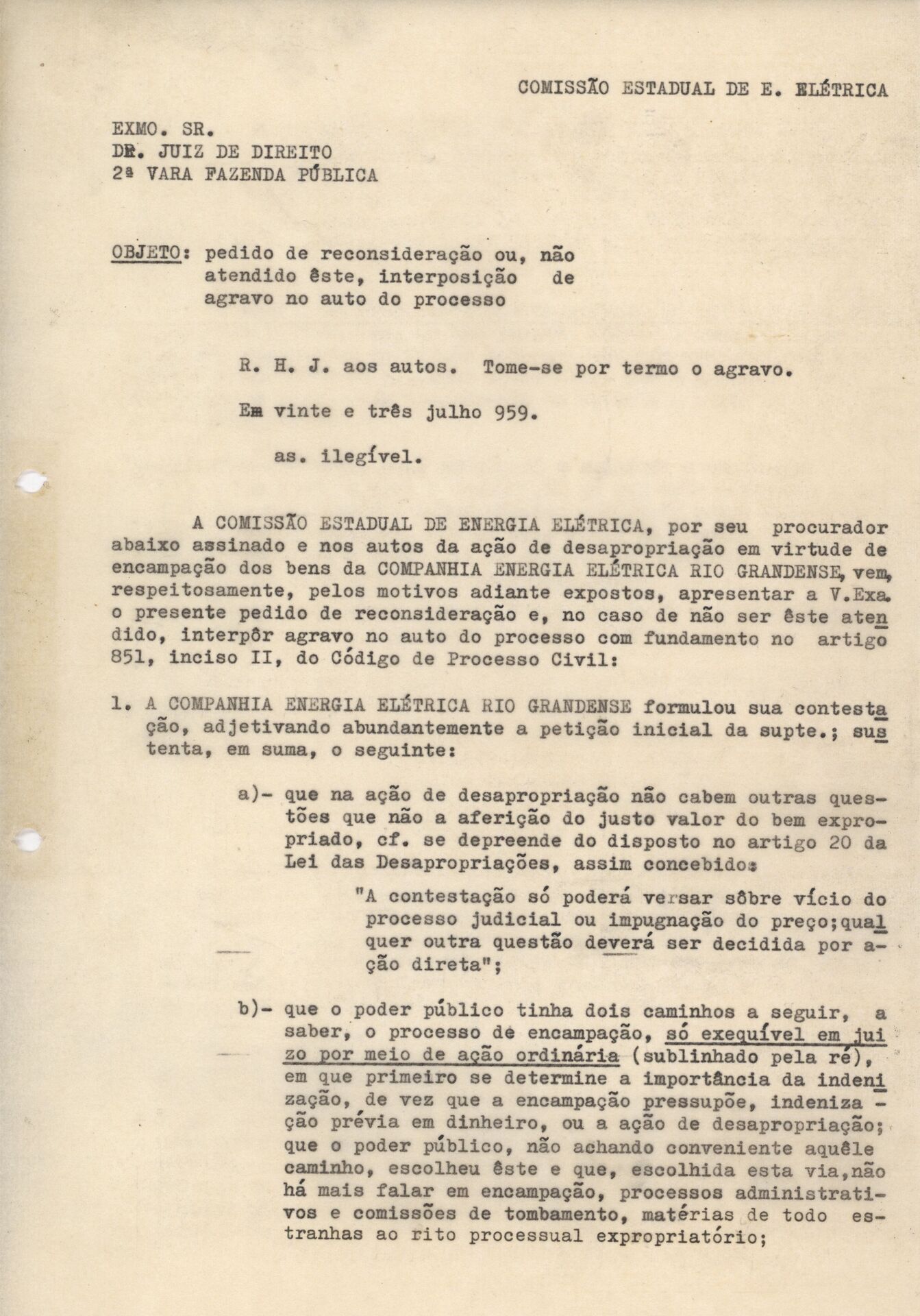 A documentação reúne peças processuais relativas à ação de desapropriação movida contra a Companhia de Energia Elétrica Rio Grandense – CEERG, decorrente da encampação de bens da empresa. Inclui o agravo interposto pela Companhia Estadual de Energia Elétrica – CEEE em 23 de julho de 1959.