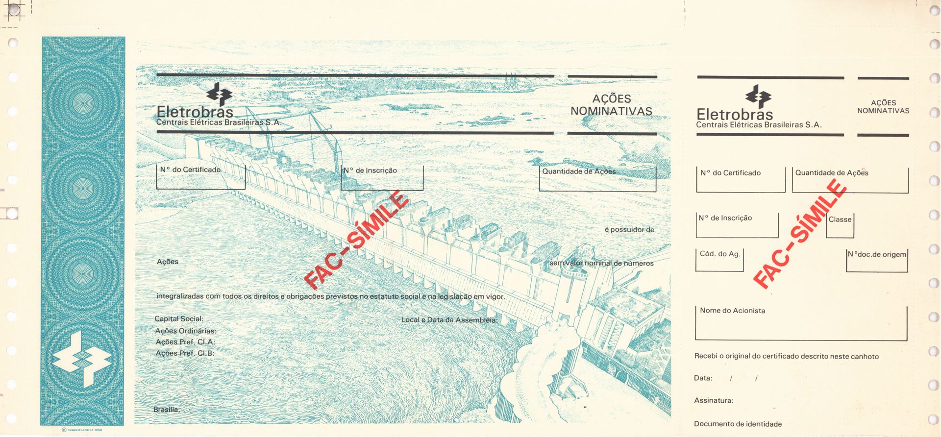 Documento referente ao modelo de recibo de ações nominativas, utilizado para o registro e comprovação da titularidade de ações, contendo campos padronizados para identificação do acionista, quantidade de ações, valores correspondentes e demais informações formais relativas às operações societárias.