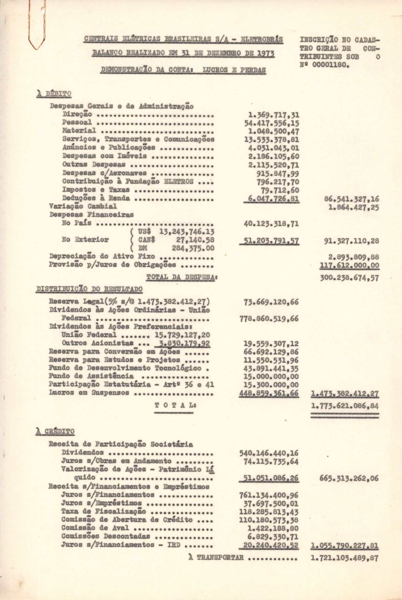Documentos relativos ao processo de balanço geral da Eletrobras, realizado em 31/12/1973, contendo informações detalhadas sobre a situação da empresa.
