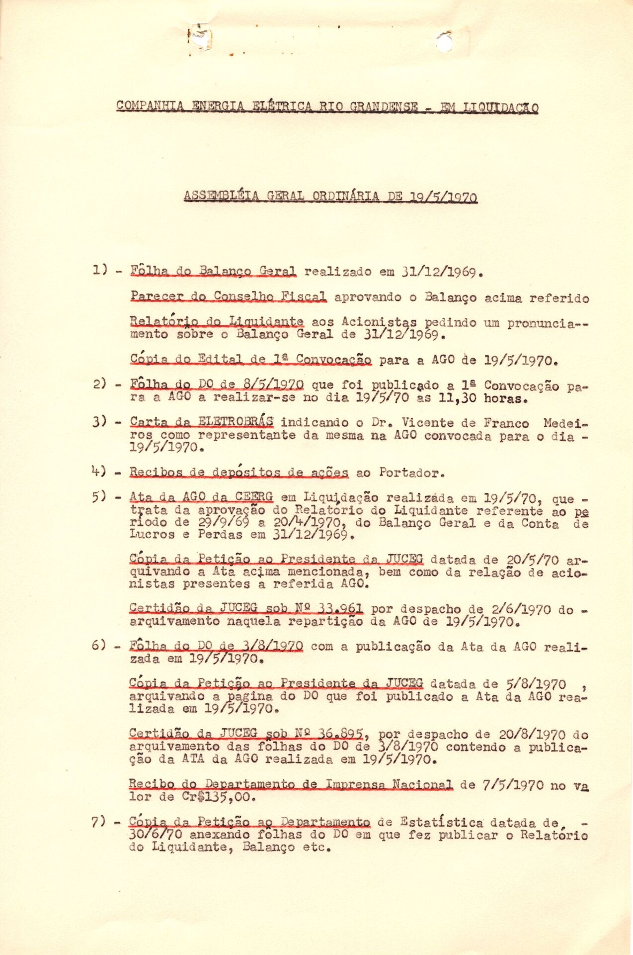 Conjunto documental relativo às deliberações da Assembleia Geral Ordinária da Companhia de Energia Elétrica Rio Grandense (CEERG), realizada em 19 de maio de 1970, referentes ao andamento do processo de liquidação da empresa. Reúne informações sobre decisões, encaminhamentos, apreciações e demais registros associados às etapas e procedimentos da dissolução institucional.