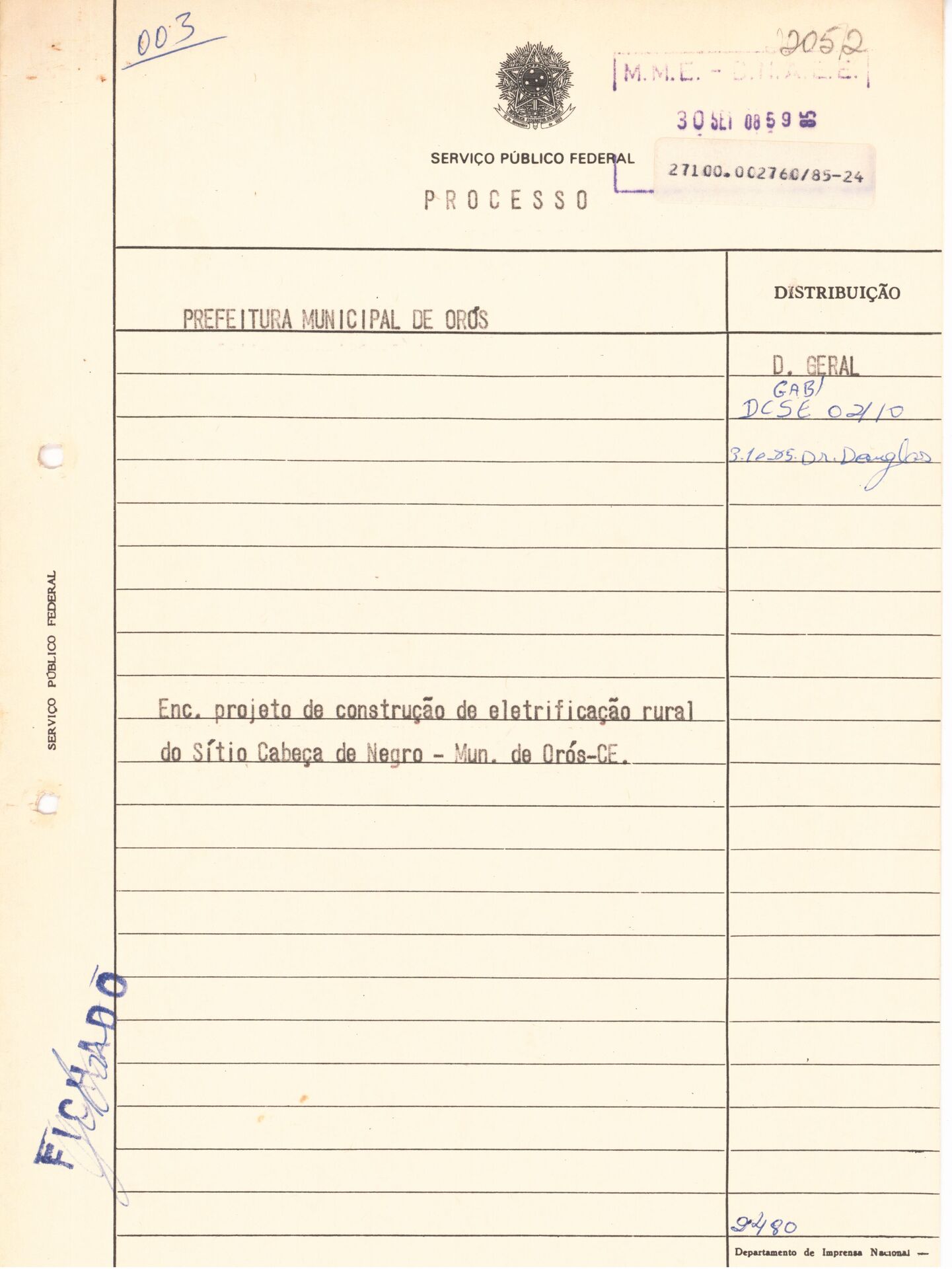 Documentos referentes ao projeto de eletrificação rural do Sítio Cabeça de Negro, localizado no município de Orós, Ceará. A documentação abrange ofício encaminhado ao Ministro de Minas e Energia, Aureliano Chaves de Mendonça, resumo orçamentário das obras a serem realizadas no sítio e relatório técnico do projeto, contemplando aspectos administrativos, financeiros e de planejamento da implantação da infraestrutura elétrica.