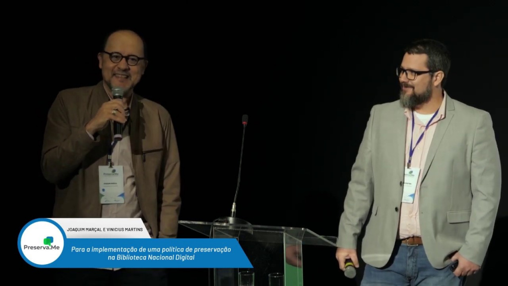 Joaquim Marçal e Vinicius Martins, representando a BNDigital e a Fundação Biblioteca Nacional, apresentaram a trajetória de evolução e consolidação das práticas de preservação da Biblioteca Nacional Digital, desde a sua criação em 2006.