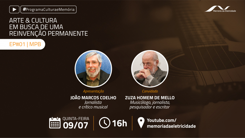 No dia 09/07 a Memória da Eletricidade lançou a série de lives "Arte & Cultura em busca de uma reinvenção permanente". No 1º episódio, o jornalista e crítico musical João Marcos Coelho conversou com o musicólogo, pesquisador, produtor musical e escritor Zuza Homem de Mello, sobre a música popular em tempos de pandemia e no pós-pandemia.