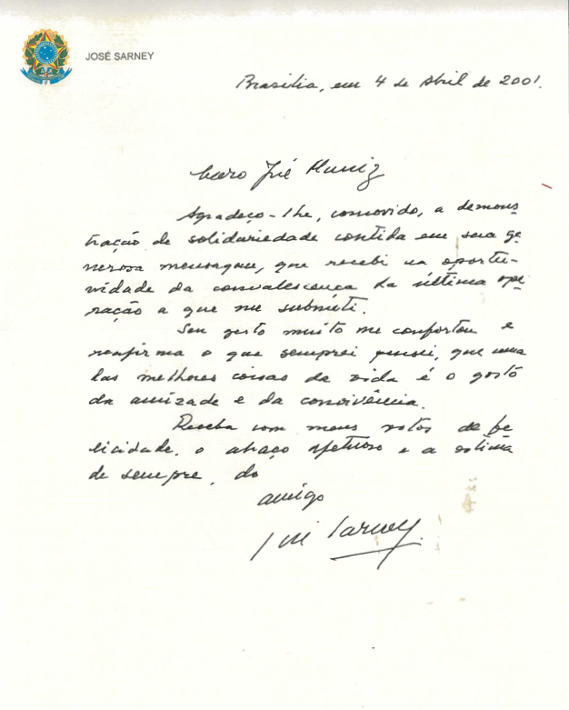 Documentos TextuaisCartas de Sarney para Muniz09/12/1998 a 04/04/2001 DescritorJosé Sarney compartilhar contribua Informações geraisNúmero de RegistroJAM.S03.D07FundoJosé Antonio Muniz Lopes / Série Atuação na Eletronorte (14/05/1985 a 08/03/2002)ArranjoNúmero de documentos3Número de páginas3Tipo DocumentalCarta Tipo documentalIdiomaPortuguêsIdiomaDescriçãoCartas de José Sarney para o titular, José Antonio Muniz, agradecendo o apoio do mesmo em diversas oportunidade.Data de aquisição25/09/2019Documentos RelacionadosJAM.S03.D07.01.pdf57,86KJAM.S03.D07.02.pdf62,74KJAM.S03.D07.03.pdf14,32K