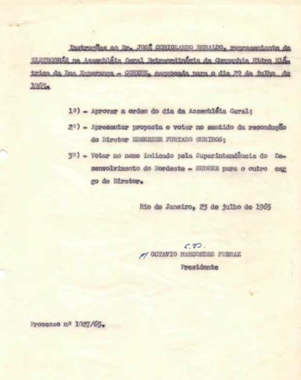Documentos referentes à Assembleia Geral Extraordinária da Companhia Hidro Elétrica Boa Esperança - COHEBE, realizada em 29 de julho de 1965, tendo como ordem do dia a eleição de diretores e outros assuntos de interesse da companhia. Inclui pauta da reunião encaminhada a José Coriolando Beraldo, representante da Eletrobras.