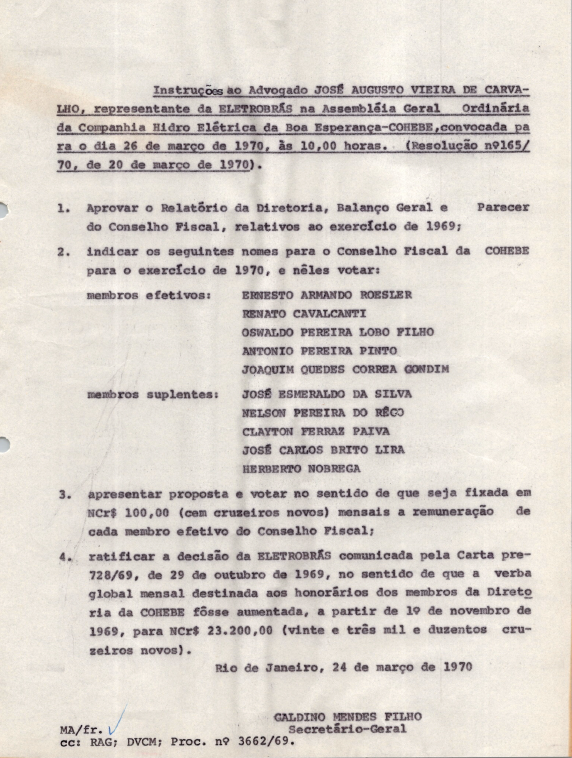 Documentos referentes à Assembleia Geral Ordinária da Companhia Hidro Elétrica Boa Esperança - COHEBE, realizada em 26 de março de 1970, tendo como ordem do dia o relatório geral da diretoria, balanço, parecer do Conselho Fiscal, eleição do Conselho Fiscal para o exercício de 1970, e outros assuntos de interesse da companhia. Inclui a pauta da reunião encaminhada a José Augusto Vieira de Carvalho, representante da Eletrobras.