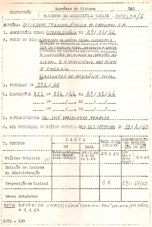 Documento referente à Assembleia Extraordinária da Sociedade Termoelétrica de Capivari - Sotelca, empresa associada a holding Eletrobras, realizada em 29 de dezembro de 1966, tendo como ordem do dia o aumento do capital social, e outros assuntos de interesse da companhia.