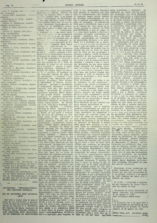 Documentos referentes à Assembleia Geral Extraordinária da Sociedade Termoelétrica de Capivari - Sotelca, empresa associada a holding Eletrobras, realizada em 24 de julho de 1967, tendo como ordem do dia a apresentação da correção monetária, aumento do capital social, e assuntos de interesse da companhia.