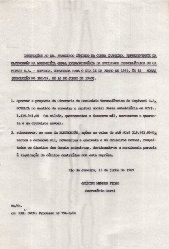 Documentos referentes à Assembleia Geral Extraordinária da Sociedade Termoelétrica de Capivari - Sotelca, empresa subsidiária da Eletrobras, realizada em 16 de junho de 1969, tendo como ordem do dia o aumento do capital social, subscrição de ações da companhia, e assuntos de interesse social. Inclui pauta da reunião encaminhada a Francisco Cândido da Cunha Carneiro, representante da Eletrobras.