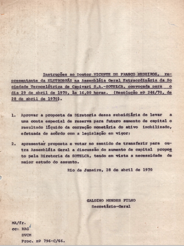 Documentos referentes à Assembleia Geral Extraordinária da Sociedade Termoelétrica de Capivari - Sotelca, empresa subsidiária da Eletrobras, realizada em 28 de abril de 1970, tendo como ordem do dia a apresentação da correção monetária, e assuntos de interesse social. Inclui pauta da reunião encaminhada a Vicente de Franco Medeiros, representante da Eletrobras.