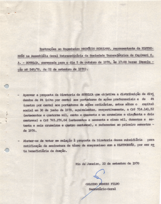Documentos referentes à Assembleia Geral Extraordinária da Sociedade Termoelétrica de Capivari - Sotelca, empresa subsidiária da Eletrobras, realizada em 05 de outubro de 1970, tendo como ordem do dia a apreciação do balanço semestral encerrado em 30 de junho de 1970, ratificação de transferência financeira feita para a Eletrobras, e assuntos de interesse social. Inclui pauta da reunião encaminhada a Maurício Schulman, representante da Eletrobras.