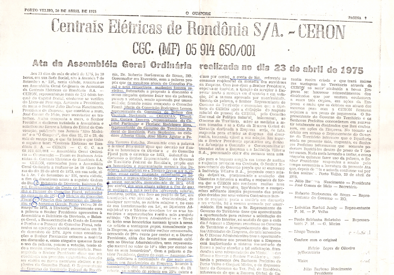 Documentos referentes à Assembleia Geral Ordinária da Centrais Elétricas de Rondônia S.A. - CERON, realizada em 23 de abril de 1975 tendo como ordem do dia a aprovação do relatório da Diretoria, balanço geral, demonstração de contas, parecer do Conselho Fiscal do exercício de 1974, eleição da Diretoria, eleição do Conselho Fiscal, fixação dos honorários da Diretoria e assuntos gerais de interesse da empresa.