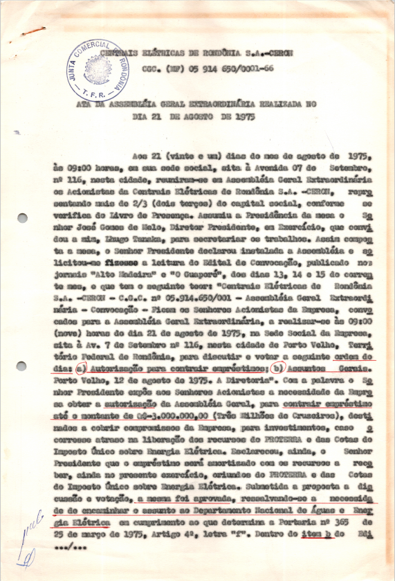 Documentos referentes à Assembleia Geral Extraordinária da Centrais Elétricas de Rondônia S.A. - CERON, realizada em 21 de agosto de 1975, tendo como ordem do dia a autorização para contrair empréstimos e assuntos gerais de interesse da empresa.