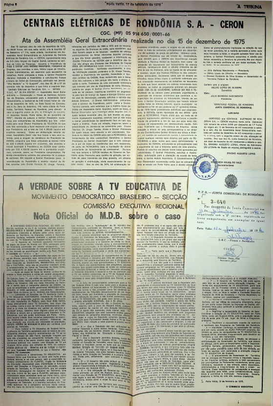 Documentos referentes à Assembleia Geral de Extraordinária da Centrais Elétricas de Rondônia S.A. - CERON, realizada em 15 de dezembro de 1975, tendo como ordem do dia a alienação de sucatas e assuntos gerais de interesse da empresa.