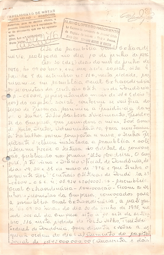 Documentos referentes à Assembleia Geral Extraordinária da Centrais Elétricas de Rondônia S.A. - CERON, realizada em 13 de junho de 1976, tendo como ordem do dia o aumento do capital social e correção monetária além de assuntos gerais de interesse da empresa.