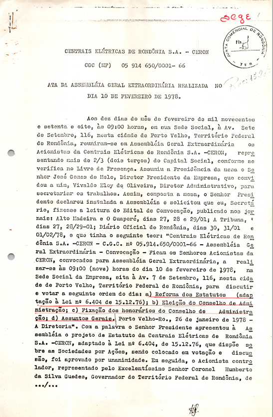 Documentos referentes à Assembleia Geral Extraordinária da Centrais Elétricas de Rondônia S.A. - CERON, realizada em 10 de fevereiro de 1978, tendo como ordem do dia a forma do estatuto, eleição do Conselho de Administração, fixação de honorários do Conselho de Administração e assuntos gerais de interesse da companhia.