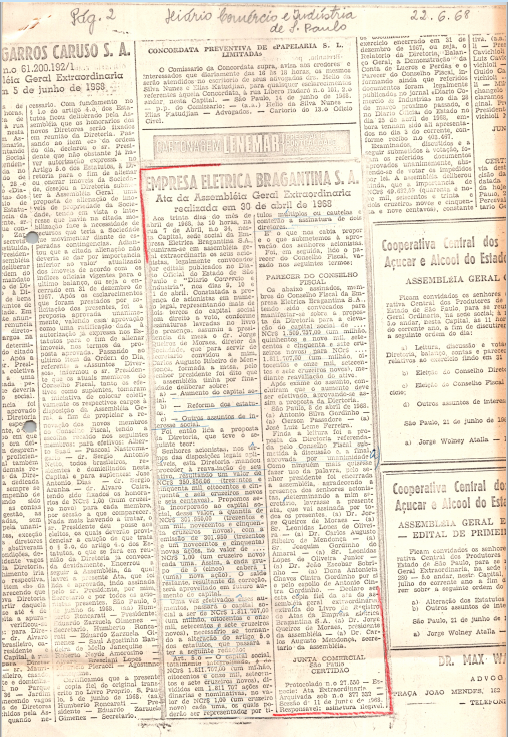 Documentos referentes à Assembleia Geral Extraordinária da Empresa Elétrica de Bragantina - EEB, realizada em 30 de abril de 1968, tendo como ordem do dia o aumento do capital social, reforma do estatuto e outros assuntos de interesse da empresa.