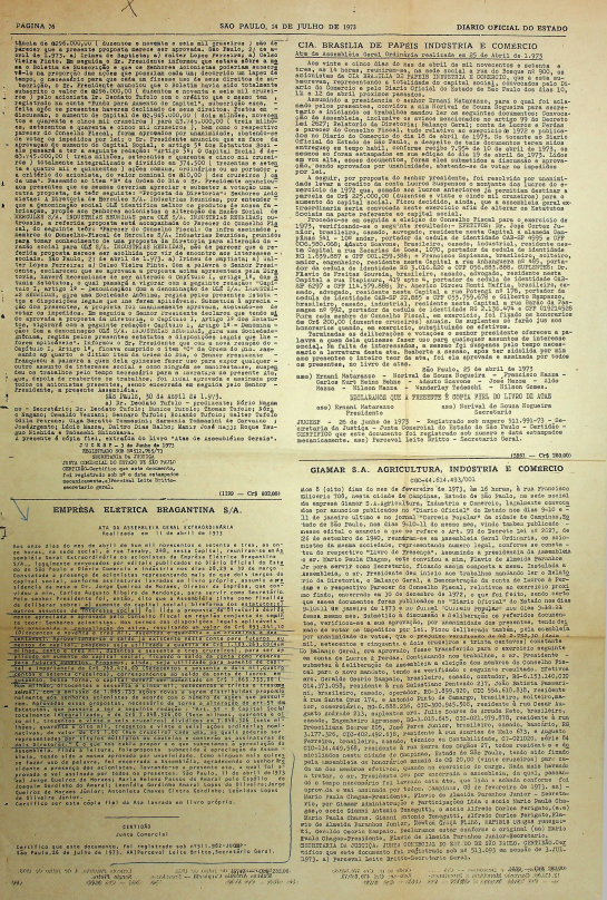 Documentos referentes à Assembleia Geral Extraordinária da Empresa Elétrica de Bragantina - EEB, realizada em 14 de abril de 1973, tendo como ordem do dia aumento do capital social, reforma dos estatutos e outros assuntos de interesse da empresa.