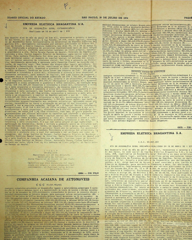 Documentos referentes à Assembleia Geral Extraordinária da Empresa Elétrica de Bragantina - EEB, realizada em 18 de abril de 1974, tendo como ordem do dia o aumento do capital social, reforma do estatuto e outros assuntos de interesse da empresa.