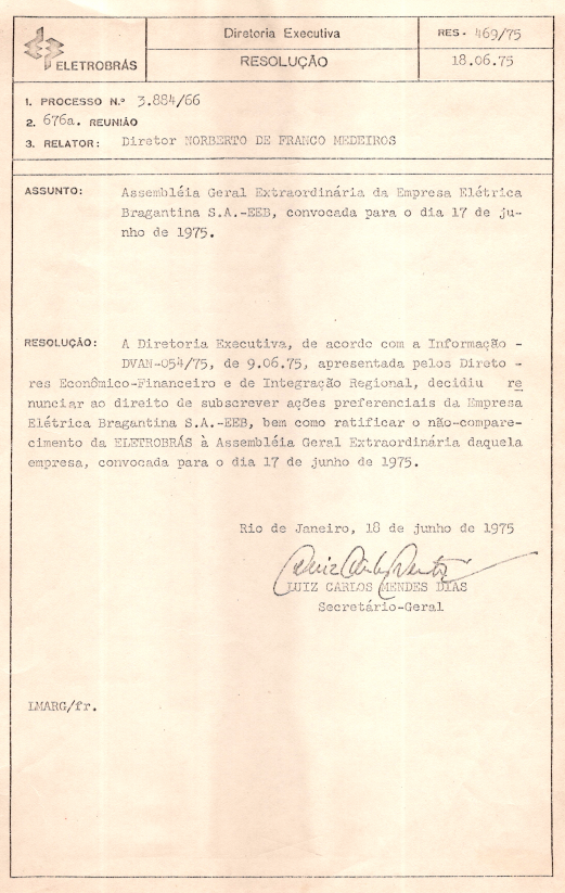 Documentos referentes à Assembleia Geral Extraordinária da Empresa Elétrica de Bragantina - EEB, realizada em 17 de junho de 1975, tendo como ordem do dia criação de ações preferenciais, aumento do capital social, com reservas e subscrição de ações preferenciais, alteração dos estatutos sociais e outros assuntos de interesse da empresa.