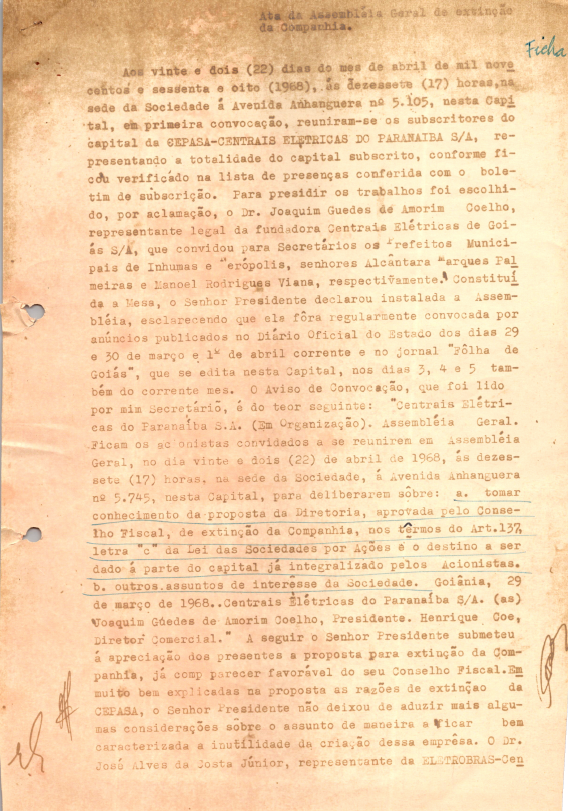 Documentos referentes à Assembleia Geral Extraordinária da Centrais Elétricas do Paranaíba S.A. - CEPASA, realizada em 22 de abril de 1966, tendo como ordem do dia a tomada de conhecimento da proposta da Diretoria, aprovada pelo Conselho Fiscal, da extinção da Companhia, além de outros assuntos de interesse da empresa.