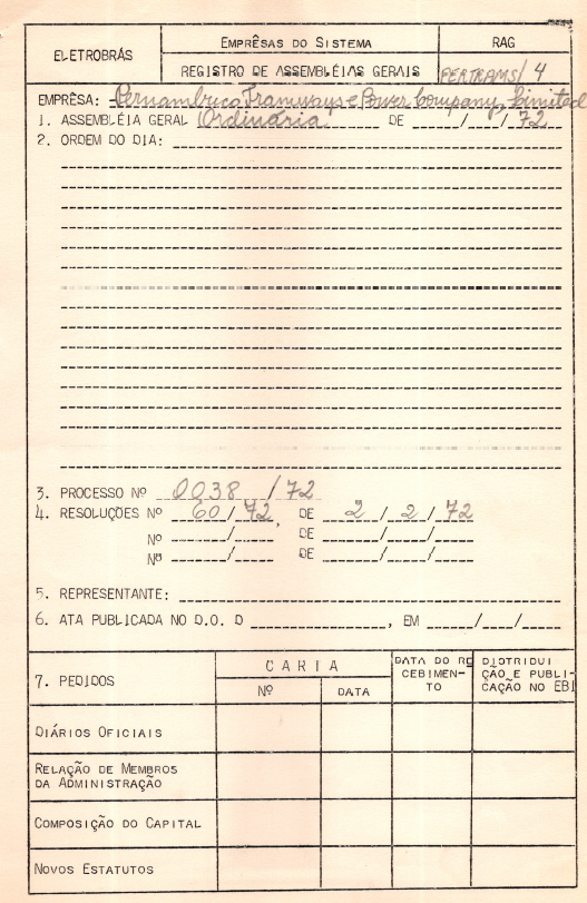 Documento referente ao registro de Assembleia Geral Ordinária da Pernambuco Tramways & Power Company Limited, que ocorreu em 1972.