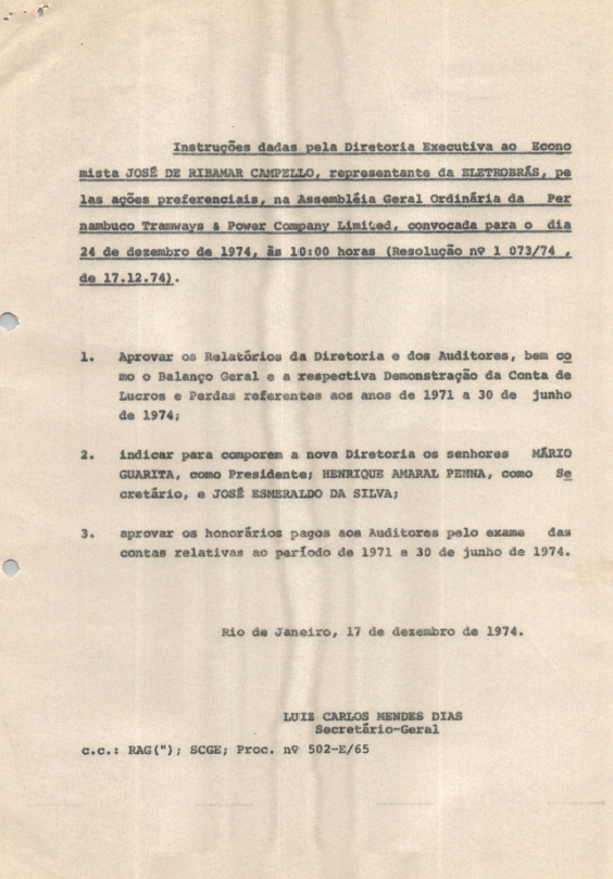 Registro de assembleia da Pernambuco Tramways & Power Company Limited de dezembro de 1974