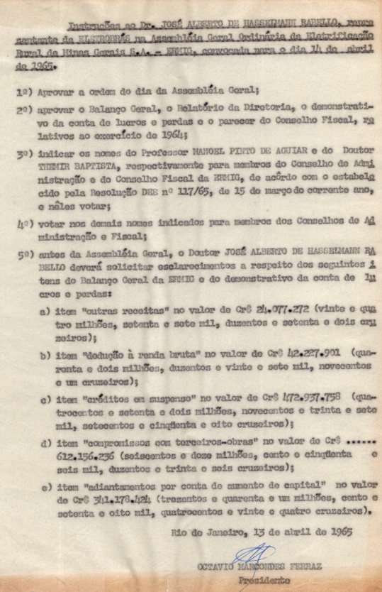 Documentos referentes à Assembleia Geral Ordinária da Eletrificação Rural de Minas Gerais S.A. - ERMIG, realizada em 11 de abril de 1965, tendo como ordem do dia o relatório da Diretoria, balanço geral, demonstração de contas e parecer do Conselho Fiscal e auditores referente ao exercício de 1964, eleição do Conselho Administrativo e Fiscal, fixação da remuneração e outros assuntos de interesse da companhia. Inclui pauta da reunião, enviada a José Alberto Hasselmann Rabello, representante da Eletrobras.
