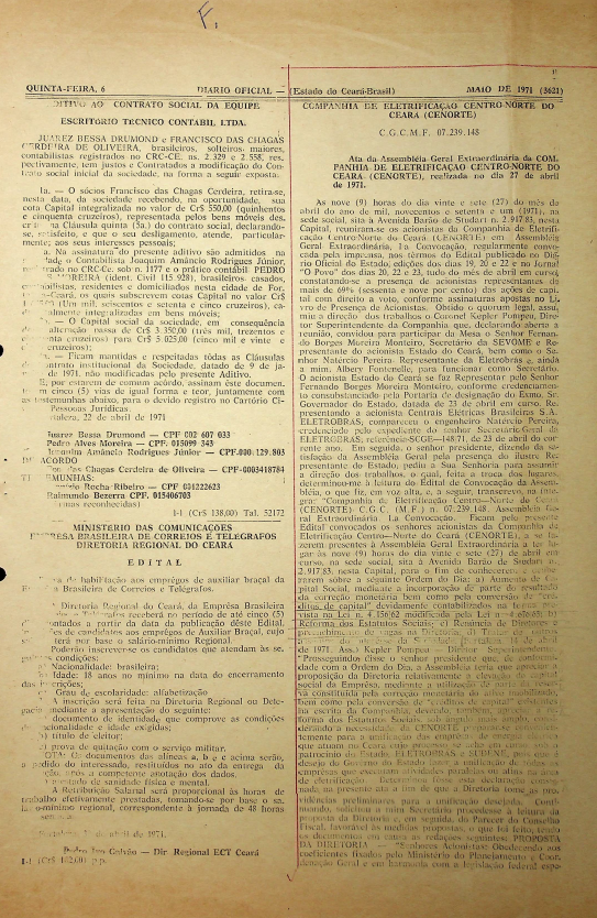 Documentos referentes à Assembleia Geral Extraordinária da Companhia de Eletrificação Centro-Norte do Ceará S.A. - CENORTE, realizada em 27 de abril de 1971, tendo como ordem do dia o aumento do capital social, a reforma parcial dos estatutos sociais e outros assuntos de interesse da companhia.