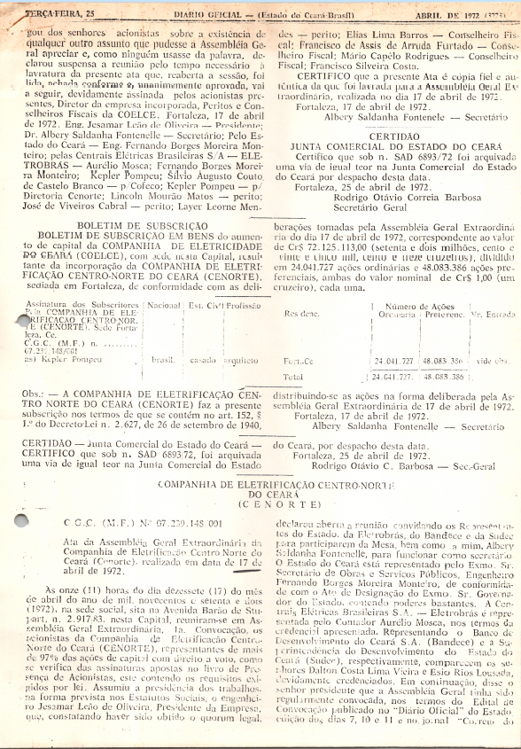 Documentos referentes à Assembleia Geral Extraordinária da Companhia de Eletrificação Centro-Norte do Ceará S.A. - CENORTE, realizada em 17 de abril de 1972, tendo como ordem do dia o conhecimento e deliberação acerca do laudo de avaliação oferecido pela missão de peritos a ser aprovado pela AGE da incorporada, relativamente a incorporação da CENORTE pela Companhia Energética do Ceará - Coelce, ratificação dos poderes conferidos pela AGE realizada em 05/04/1972 , autorizando ainda a diretoria a subscrever em bens, com base no valor identificado no laudo referido no item anterior e outros assuntos de interesse da companhia.