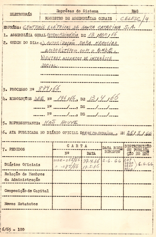 Registro de Assembleia Geral Extraordinária da CELESC de abril de 1966