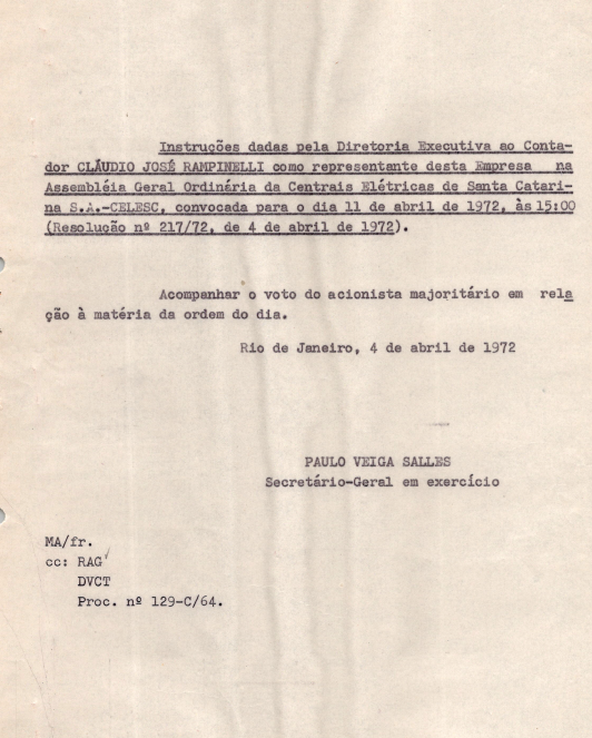 Documentos referentes à Assembleia Geral Ordinária das Centrais Elétricas de Santa Catarina S.A. - CELESC, empresa associada da Eletrobras, realizada em 11 de abril de 1972, tendo como ordem do dia a deliberação sobre o relatório, balanço, conta de lucros e perdas referentes ao exercício de 1971 e parecer do Conselho Fiscal, eleição dos membros do Conselho Fiscal e Deliberativo e fixação dos seus honorários, e outros assuntos de interesse da companhia. Inclui a pauta da reunião encaminhada a Cláudio José Rampinelli, representante da Eletrobras.