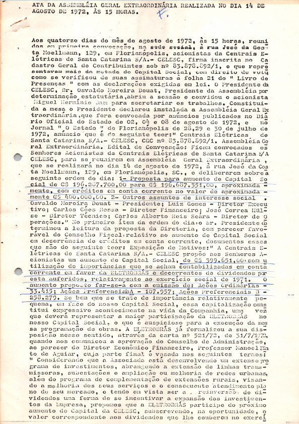 Registro de Assembleia Geral Extraordinária da CELESC de agosto de 1972