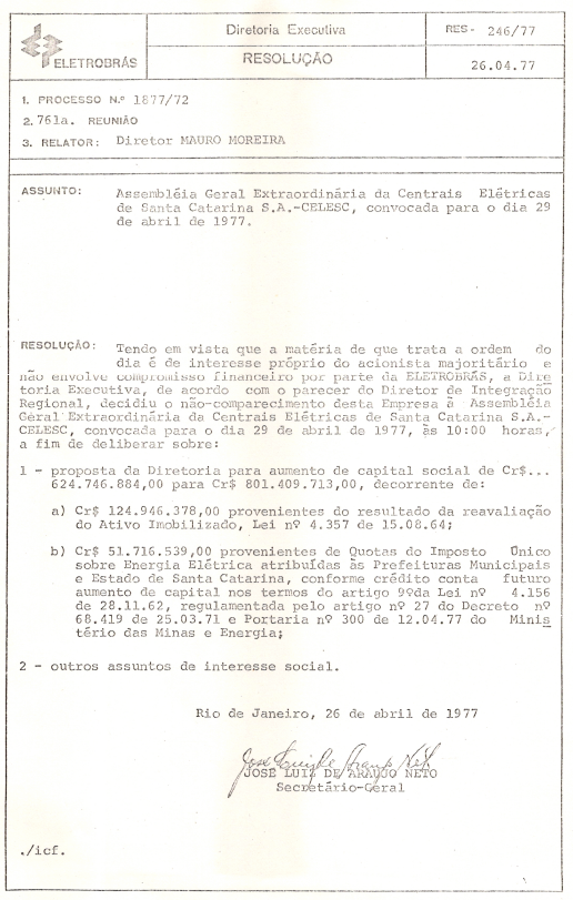 Registro de Assembleia Geral Extraordinária da CELESC de abril de 1977
