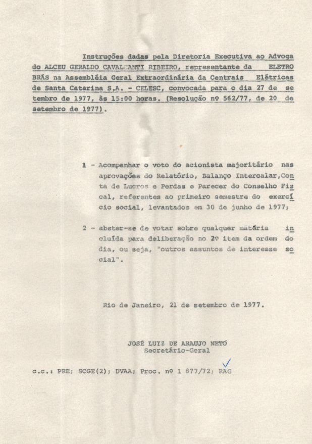 Registro de Assembleia Geral Extraordinária da CELESC de setembro de 1977