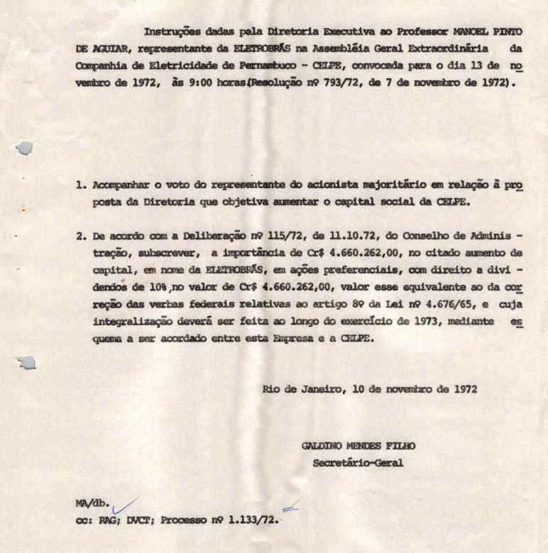 Documentos referentes à Assembleia Geral Ordinária da Companhia de Eletricidade de Pernambuco - CELPE, empresa associada da Eletrobras, realizada em 12 de novembro de 1972, tendo como ordem do dia a aprovação do aumento do capital social, apreciação do laudo técnico de avaliação de bens e instalações do acionista Departamento de Água e Energia - DAE, utilização de créditos da Centrais Elétricas Brasileiras S.A. - Eletrobras, alteração consequente dos Estatutos Sociais da empresa, e outros assuntos de interesse da companhia. Inclui pauta da reunião encaminhada a Manoel Pinto de Aguiar, representante da Eletrobras.