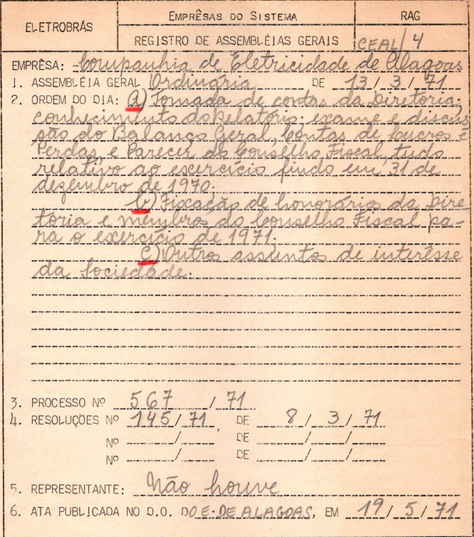 Documentos referentes à Assembleia Geral Ordinária da Companhia de Eletricidade de Alagoas - CEAL, realizada em 13 de março de 1971, tendo como ordem do dia tomada de contas da Diretoria, parecer do Conselho Fiscal, fixação dos honorários da Diretoria e outros assuntos de interesse da sociedade.