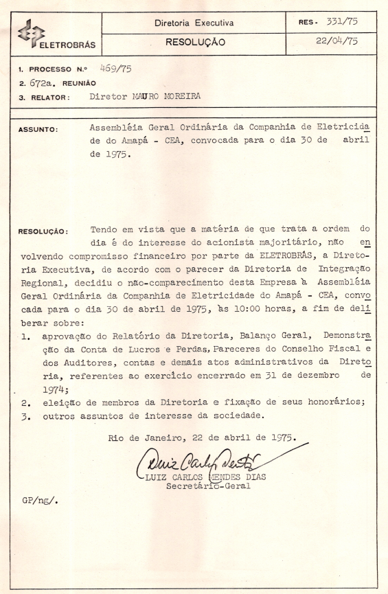 Documentos referentes à Assembleia Geral Ordinária da Companhia de Eletricidade do Amapá - CEA, realizada em 30 de abril de 1975, tendo como ordem do dia o balanço geral, contas de lucros e perdas, relatório da diretoria do exercício de 1974, eleição de membros da diretoria e do conselho fiscal, fixação dos honorários e outros assuntos de interesse da companhia.