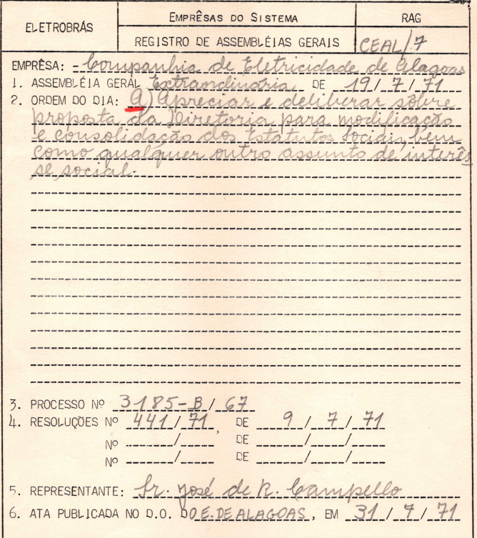 Documentos referentes à Assembleia Geral Extraordinária da Companhia de Eletricidade de Alagoas - CEAL, realizada em 19 de julho de 1971, tendo como ordem do dia a modificação do estatuto social e assuntos relativos. Possui pauta da referida assembleia enviada a José de Ribamar Campello, representante da Eletrobras.