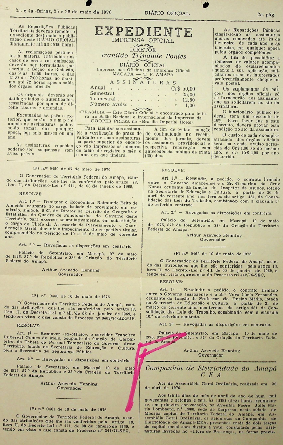 Documentos referentes à Assembleia Geral Extraordinária da Companhia de Eletricidade do Amapá - CEA, realizada em 30 de janeiro de 1976, tendo como ordem do dia a ratificação de nome da comissão de avaliação dos bens da Usina Hidrelétrica Coaracy Nunes; aprovação do laudo produzido pela comissão e aprovado pelo DNAEE, ratificar os termos do laudo de intenção feito pelos acionistas da CEA, referendar os poderes da diretoria, aumento do capital e outros assuntos de interesse da companhia.
