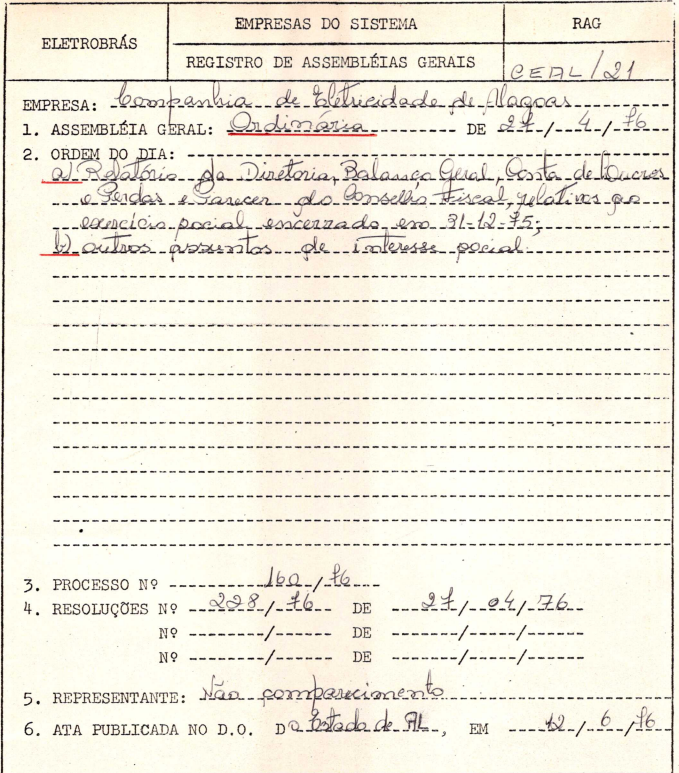 Documentos referentes à Assembleia Geral Ordinária da Companhia de Eletricidade de Alagoas - CEAL, realizada em 03 de abril de 1973, tendo como ordem do dia Relatório da Diretoria, Balanço Geral, conta de lucros e perdas, parecer do Conselho Fiscal e outros assuntos de interesse da empresa.